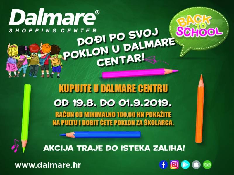 Od 19. kolovoza do 1. rujna svaki posjetitelj centra, za kupnju od minimalno 100 kuna, ima priliku osvojiti školski pribor koji daruje Dalmare u svojim brojnim trgovinama. Dovoljno je sačuvati račun i pokazati ga na pultu, koji se nalazi na prvoj etaži, a ljubazna hostesa će nakon pregleda računa i izvlačenja dodijeljenog broja nagraditi vašeg mališana pernicom, ruksakom, bojicama, temperama, flomasterima, šestarima i ostalim nužnim stvarima. Lista poklona je doista bogata i izmamit će osmijeh na licima vaših školaraca.