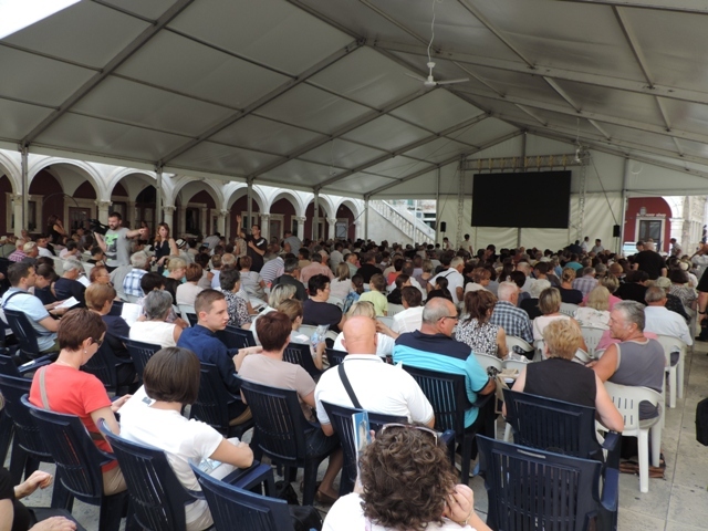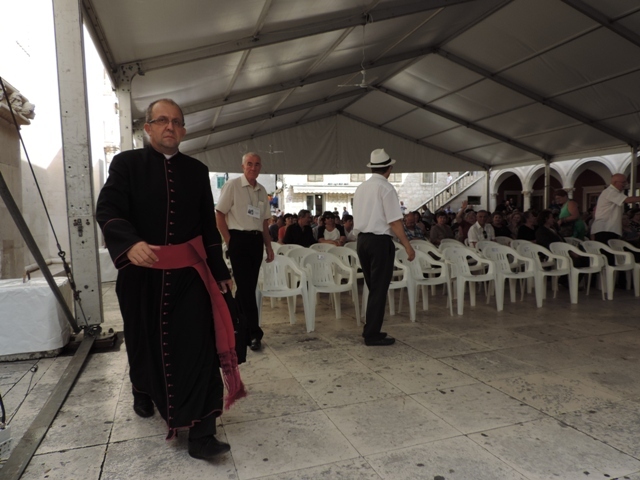 Šator koji se proteklog vikenda postavljao na Trgu Republike Hrvatske, između katedrale sv. Jakova i Gradske vijećnice, a koji bi trebao primiti i preko 2 tisuće vjernika, koliko ih se očekuje danas u Šibeniku povodom ređenja, napunio se već do 10 sati.