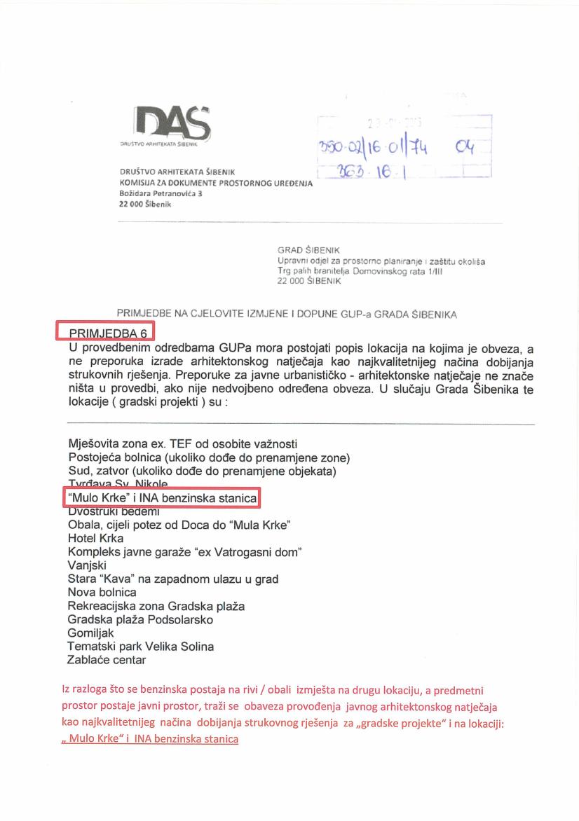 Ponavljamo da smo prilikom javne rasprave pismeno uputili zahtjev izrađivačima plana za obaveznu provedbu natječaja na lokaciji "Mulo Krke" i Ina benzinska stanica (u prilogu),