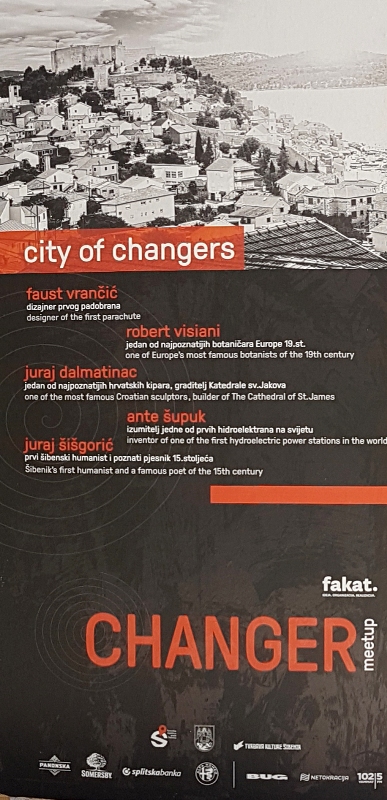 Na velikim panoima Changer meetupa, ispod slike Šibenika koji predstavljaju kao „city of changers" zgodno i domišljato navedene su četiri povijesne šibenske ličnosti koje su svaka u svoje vrijeme bile začetnici i nositelji promjena i napretka, a uz koje pišu gluposti.