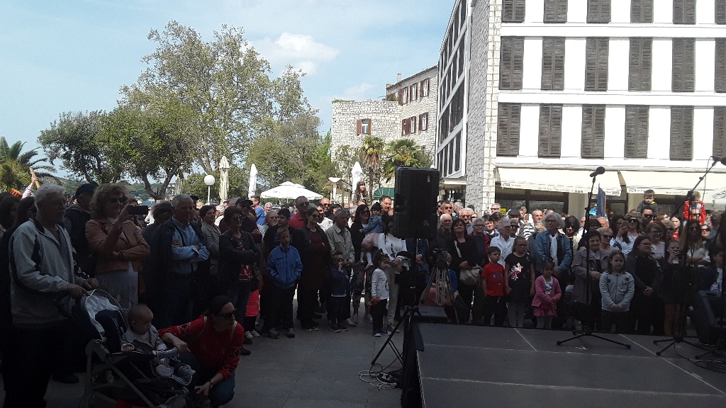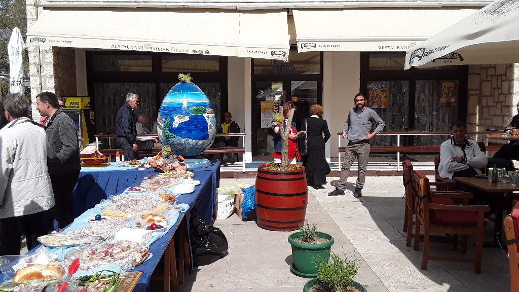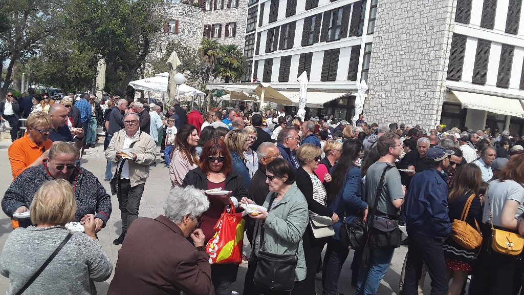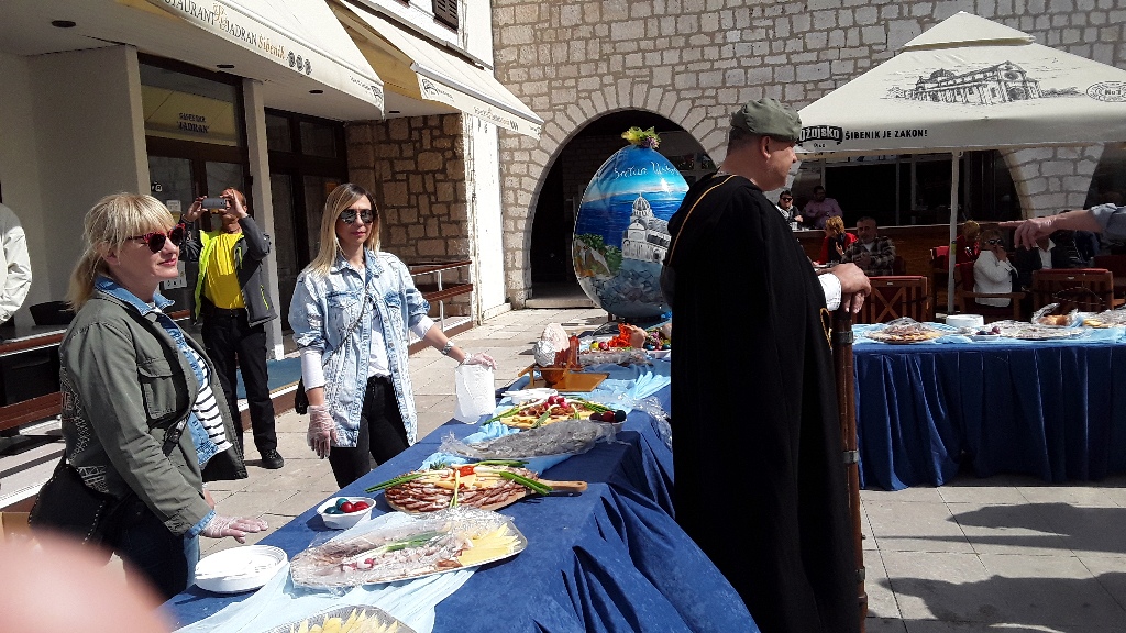 Tradicionalni Uskrsni doručak poslužen je i danas Šibenčanima i gostima Šibenika na trgu ispred zgrade Šibensko - kninske županije u organizaciji Udruženja obrtnika Šibenik s već tradicionalnom ponudom - fritajom sa slaninom i šparogama te suhomesnatim proizvodima. Organizatori su posjetitelje malo izgladnjeli jer je umjesto u 10.30 , kako je bilo najavljeno dijeljenje besplatnih obroka počela oko 11.30. ali su isto tako vrlo brzo planuli. Dok se čekala hrana bio je organiziran kulturno - umjetnički program na kojem su nastupile dječje folklorne grupe i šibenske Šuštine, a okupljene je pozdravio i čestitao im uskrs šibenski gradonačelnik Željko Burić. Poslije toga ih je zabavlja klapa More.