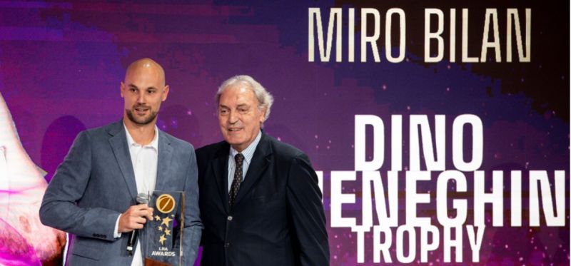 Miro Bilan, šibenski centar, koji u Italiji nosi dres Brescie, dobio je sinoć trofej Dino Meneghin, za najboljeg igrača talijanskog prvenstva prošle sezone. Na svečanosti u Milanu, Bilan je trofej primio upravo od talijanske košarkaške legende, danas 75-godišnjeg Meneghina.