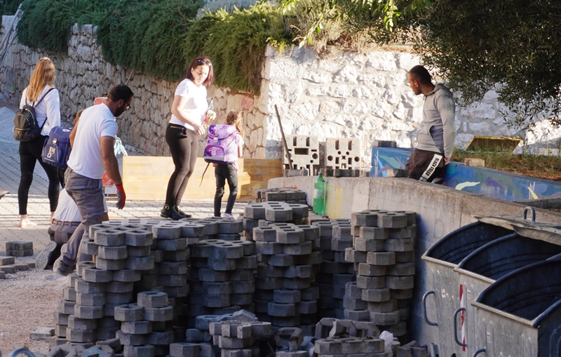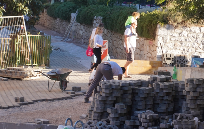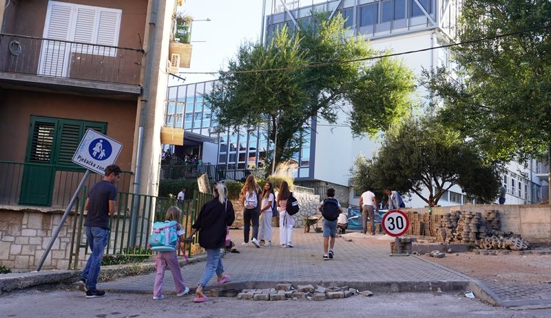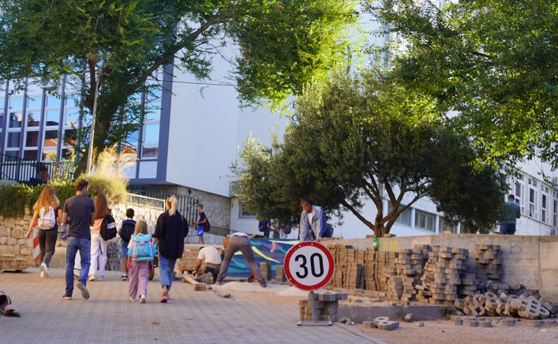 Nitko se nije pojavio ni jutros da ih barem simbolično čuva prvog dana škole, a nisu postavljena ni bilo kakvi znakovi koji bi djecu upozorili da moraju prijeći preko gradilišta, preko iskopa i hrpa građevinskog materijala, osim besmislenog u pješačkoj zoni postavljenog prometnog znaka ograničenja brzine kretanja vozila na 30 kmh.