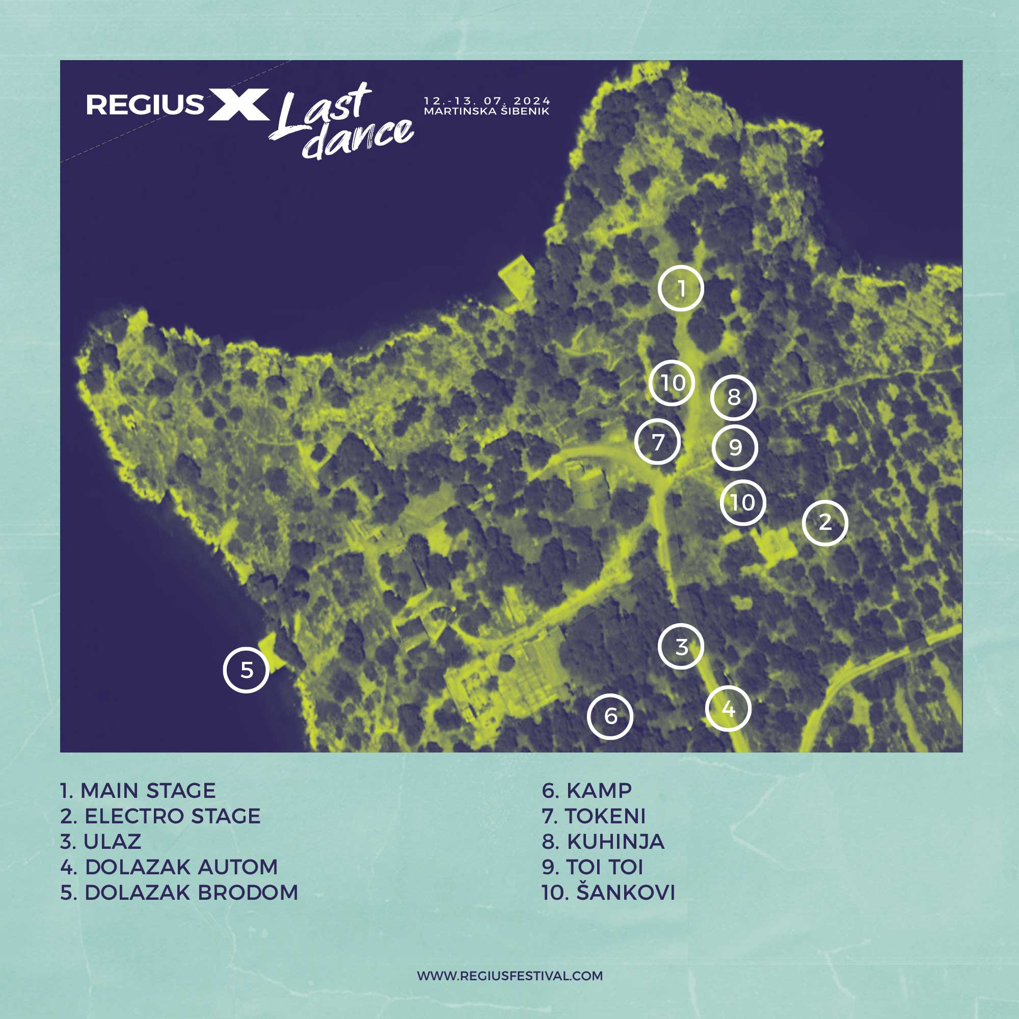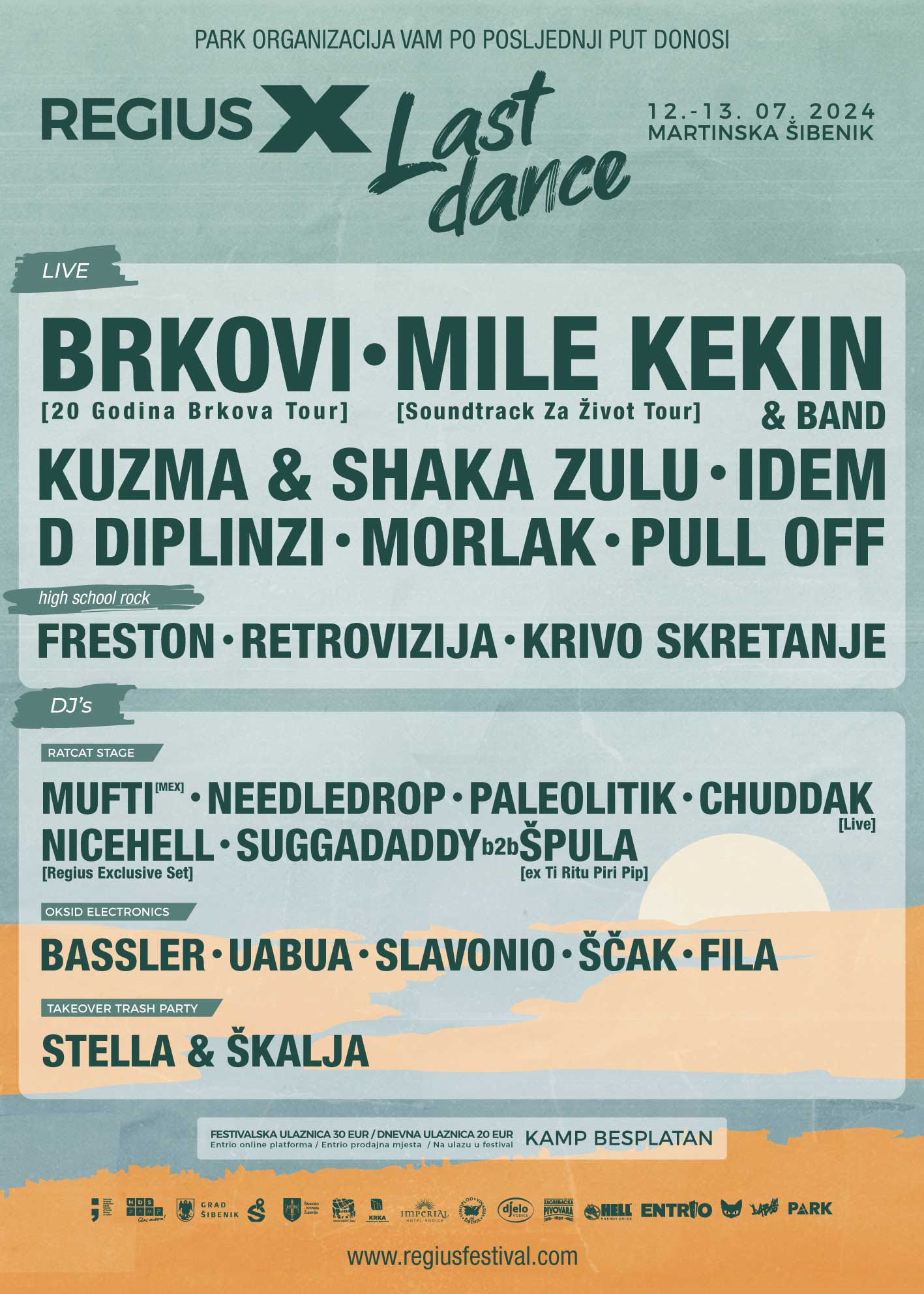 Sutra, u petak 12. srpnja u 18 sati otvaraju se festivalska vrata jubilarnog desetog i posljednjeg izdanja šibenskog Regius Festivala. U iduća dva dana na dvije pozornice izmijenit će se deset bendova i 14 DJ-eva uz sudjelovanje tri lokalne organizacije Takeover, Oksid & RatCat.