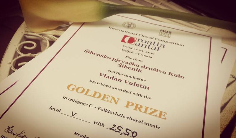 Šibensko pjevačko društvo Kolo osvojilo je zlatnu medalju u konkurenciji više od 35 zborova na međunarodnom Natjecanju i festivalu zborova Croatia Cantat održanom 1. listopada u Osijeku.