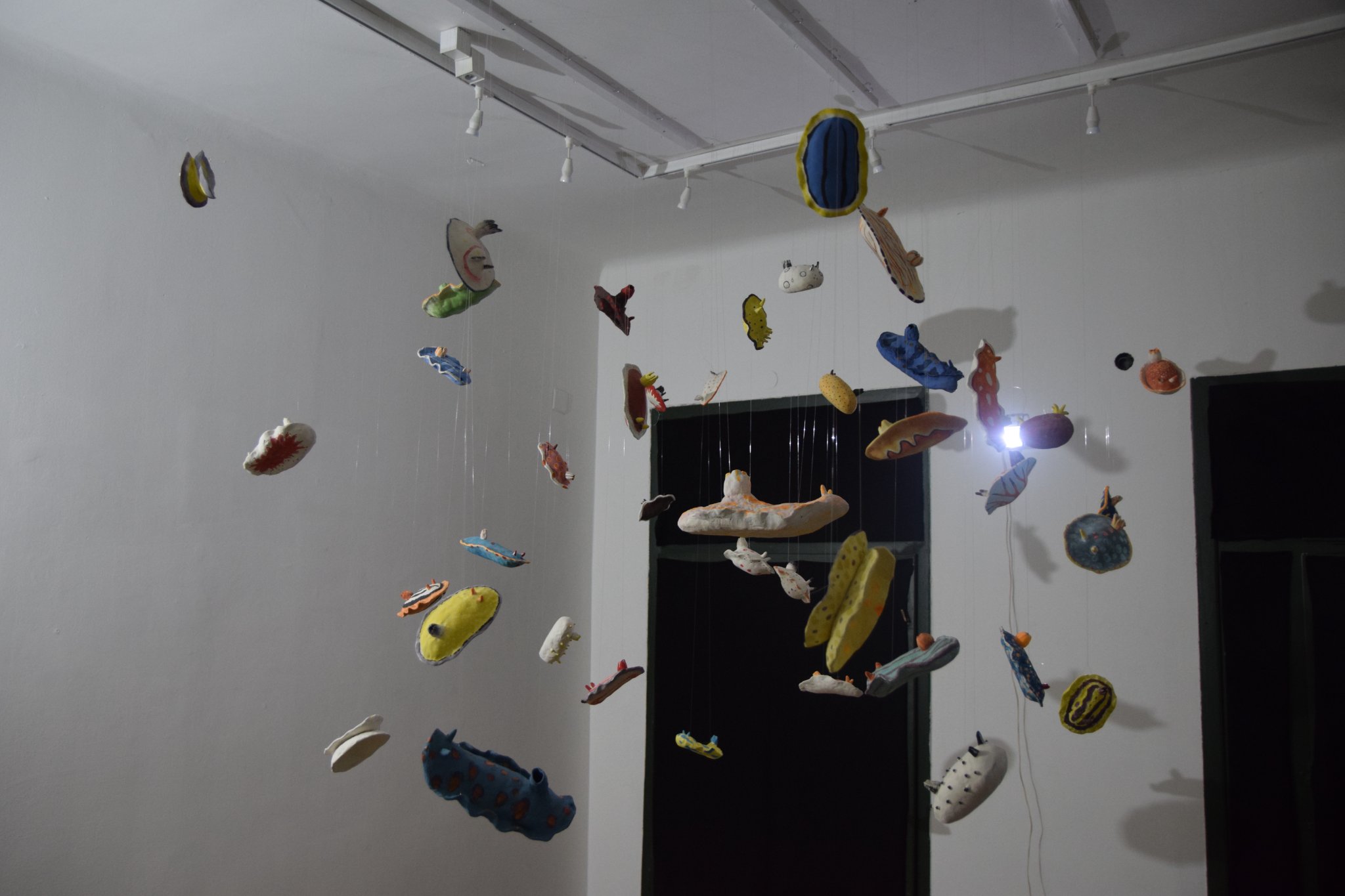 Dvosmislenost naslova namjerno je tu jer sam na ovoj izložbi htjela prikazati dvije perspektive. Naslov izložbe odnosi se na doslovnu okolinu bića prilagođenih morskim uvjetima, ali i na život čovjeka koji svoj život provodi pod pritiskom koji proizlazi iz naše civilizacije i intelekta. Pogled čovjeka analizira, osvjetljava i racionalno pokušava shvatiti ostali živi svijet, čovjek pokušava uvidjeti odakle dolaze sve prilagodbe životinje. Čovjek je biće koje ima neutaživu žeđ za znanjem. No, također, ima osjećaj izdvojenosti, nepovezanosti s drugim životom. Priroda je, za njega, tu da čovjeku služi. Iskorištavamo je do samog kraja i za sobom obično ostavljamo osiromašena ili zagađena područja. More služi kao smetlište jer je to svijet koji nije izložen našim pogledima, čini nam se kao izvanzemaljski planet. Što se tiče nama nevidljivog zagađenja mora – prošle sam godine u suradnji s Akademijom likovnih umjetnosti u Zagrebu i udrugom Val kulture producirala sedam metarsku kornjaču od plastičnog otpada izvađenog iz mora. Ta kornjača proputovala je nekoliko hrvatskih gradova s ciljem da potakne stanovnike da osvijeste problem zagađenja voda. Iz komunikacije s ronilačkim udrugama i organizacijama koji se bave čišćenjem mora saznala sam da ga na dnu ima napretek. Uz plastični otpad, tu su hladnjaci, željezo i staklo, koje je iznimno problematično jer se jako sporo razgrađuje i, zatrpavajući morsko dno, uništava cijele morske ekosustave. Iako na ovoj posljednjoj izložbi nije eksplicitno prikazana materija kojom zagađujemo svoj okoliš, promjenama svjetla i tame sam htjela ukazati na to da se ljudska i životinjska perspektiva razlikuju. Svijet nije naše igralište. Ako želimo biti vlasnici prirode i svih bića koja žive na Zemlji, to podrazumijeva odgovoran odnos prema onome za što vjerujemo da posjedujemo. Morski puž, čovjek i bezbrojne druge vrste mogle bi izumrijeti zbog viškova kojima zatrpavamo biološki svijet kojeg smo ipak i sami dio. Moglo bi se reći da je poruka ove izložbe sljedeća: morski puž je pod pritiskom, čovjek je pod pritiskom i naš planet je pod pritiskom. Od čega su napravljeni radovi i kako to da svijetle u mraku? Što vas je inspiriralo da izrađujete baš te puževe, po čemu su oni posebni? Skulpture su napravljene od keramike. Prvo su pažljivo oslikane bojama za keramiku, a zatim su, nakon pečenja, dovršene slojem posebnog luminiscentnog pigmenta na bazi stroncijevog aluminata koji se, kad je osvijetljen, puni, a zatim isijava svjetlo u mraku. Jedna od posebnosti morskog života je to što je kod morskih životinja bioluminiscencija jako česta. To je jedna od brojnih prilagodbi morskog života. Svijetle neki planktoni, bičaši, ribe, morski puževi, čak i morske kornjače. Morski puž ima fascinantne sposobnosti na kojima mu možemo samo zavidjeti. On je sitni predator koji živi jednostavan život. Prilagođava se okolini najbolje što može. Život provodi u potrazi za hranom. Razmnožava se s bilo kojom drugom jedinkom svoje vrste jer je hermafrodit. No, ono najmanje shvatljivo iz naše perspektive – iako je morski puž šaren, pa čak i sladak, on vidi samo svjetlo i tamu kroz koje napipava svoj put. Morski puževi doslovno imaju supermoći. Sve što pojedu, transformiraju u prednost za sebe. Vrste morskih puževa koje se hrane otrovnim životinjama imaju sposobnost integrirati otrov u svoje tijelo i tako se zaštititi od toga da oni budu obrok. Neki jedu alge kad su mladi, uzgajaju ih u svom tijelu i tako dobiju sposobnost da se hrane svjetlom i proizvode klorofil kao odrasle životinje. Moguće im je odrezati bilo koji dio dijela i on će se opet regenerirati. Zbog toga ih se proučava kao potencijalnu polazišnu točku iz koje će se pronaći lijek za rak. Morski puževi imaju malo prirodnih neprijatelja, rizik za njih su najčešće drugi morski puževi.