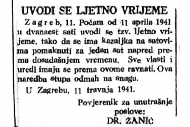 Na današnji dan 11. travnja 1941. godine, dan nakon proglašenja Nezavisne Države Hrvatske, u Hrvatskoj je uvedeno ljetno računanje vremena. Kazaljke na satovima prvi su puta morale biti pomaknute jedan sat naprijed u odnosu na uobičajeno računanje vremena. Naredbu o uvođenju ljetnog računanja vremena po uzoru na Njemačku, u kojoj se ta praksa provodi od 30. travnja 1916. godine, izdao je Povjerenik za unutarnje poslove NDH dr. Žanić.