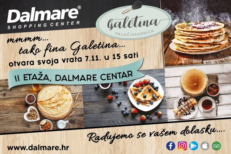 Zato zapišite u kalendare 7. studenoga i pridružite nam se u što većem broju u 15 sati na otvorenju nove palačinkarnice Galetina koja se nalazi na drugoj etaži centra Dalmare.