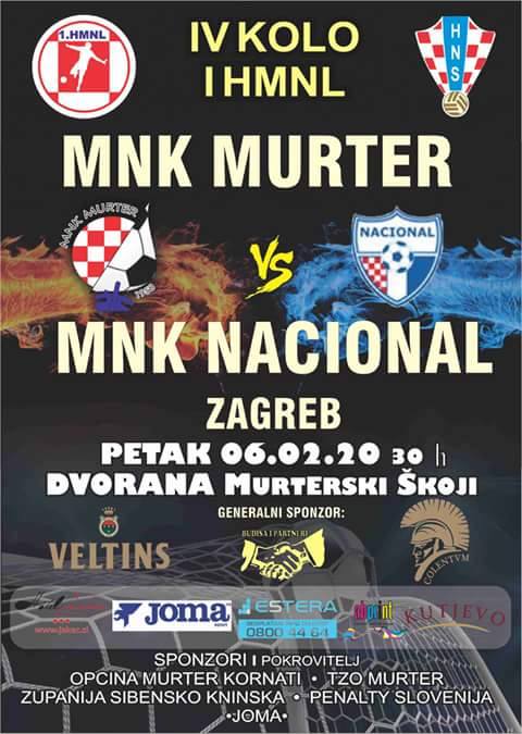 U 14. kolu 1. Hrvatske malonogometne lige koje se održava u petak 6. veljače, MNK Murter igra derbi protiv MNK Nacional koji je trenutno vodeća ekipa Lige. Susret je na rasporedu u 20:30 sati u sportskoj dvorani Murterski škoji, a na noge jedinom županijskom nogometnom prvoligašu dolaze reprezentativci Hrvatske i Srbije koji igraju za zagrebački klub. Nakon 13. kola Murterini se nalaze na 5. mjestu ljestvice, a cilj je da se održe do kraja 22. kola u prvih šest jer tada ulaze u Završnicu za prvaka. Iz MNK Murter šalju javni poziv svim simpatizerima na nogometnu feštu u petak.