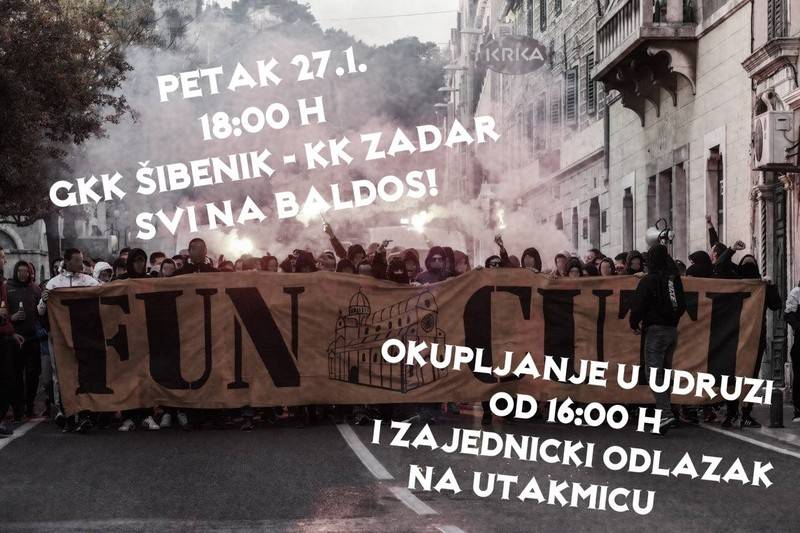 Uoči utakmice 15. kola A-1 lige za košarkaše, GKK Šibenik dočekuje KK Zadar. Utakmica se igra u petak, 27. siječnja, s početkom u18 sati, u sportskoj dvorani na Baldekinu, a članovi udruge navijača Funcuti Šibenik pozivaju sve zaljubljenike u košarku da im se pridruže na tribinama, pa i ranije.