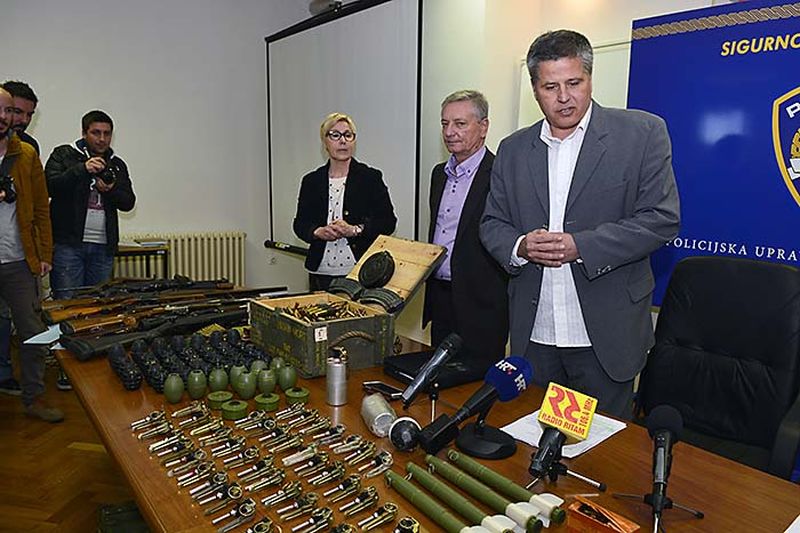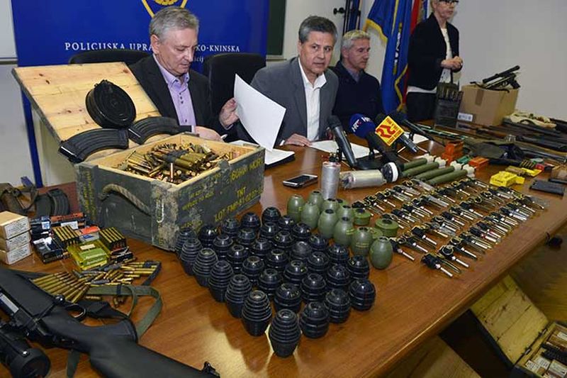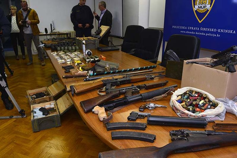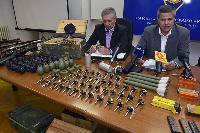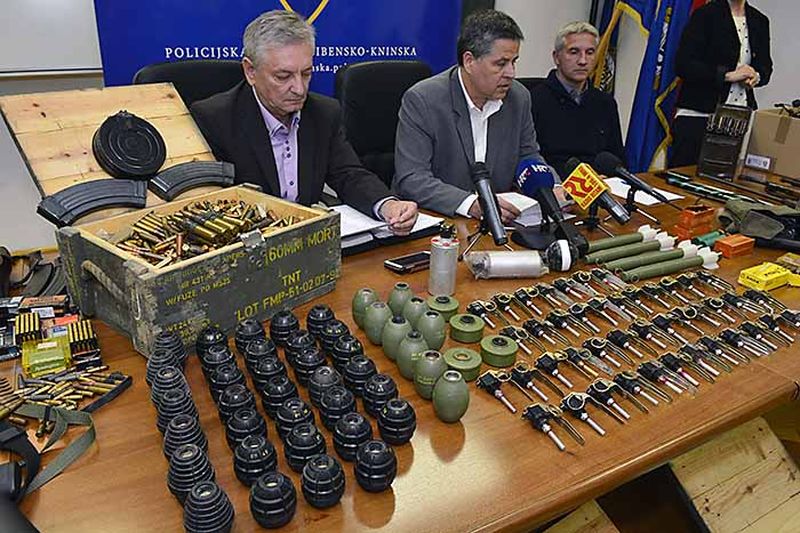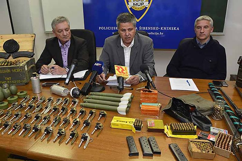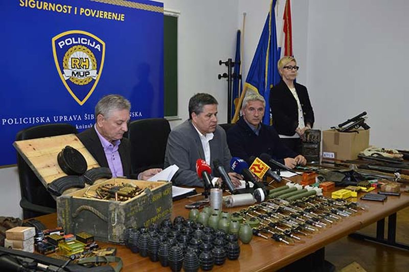 Znatnu količina oružja i eksplozivnih tvari pronašli su i oduzeli djelatnici Policijske uprave šibensko kninske u dvije akcije koje su proveli u Vodicama i Šibeniku u travnju. Zapljenili su 15 pušaka, tri pištolja, 44 ručne bombe, četiri tromblona, dvije minobacačke bombe, protupješačkih mina i preko pet tisuća komada streljiva. O tomu su javnost na konferenciji za novinare danas izvijestili Ivica Kostanića, načelnika Policijske uprave, Sandro Santini, zamjenik načelnika Policijske uprave Zdravko Sedlara, voditelj Službe kriminalističke policije.