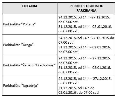 Ulična parkirališta neće raditi 24.12.2015. od 14. sati te 25. 26. i 27. prosinca 2015. godine, za božićne blagdane dok za novogodišnje blagdane parkirališta neće raditi 31.12. 2015. od 14. sati i 1.1.2016. godine.