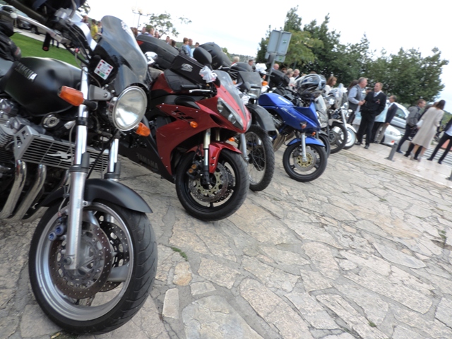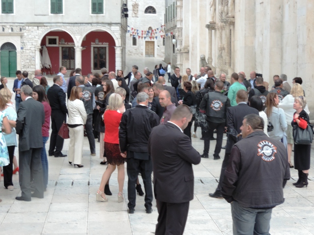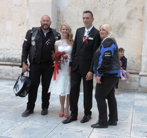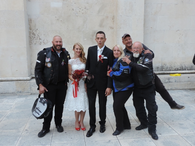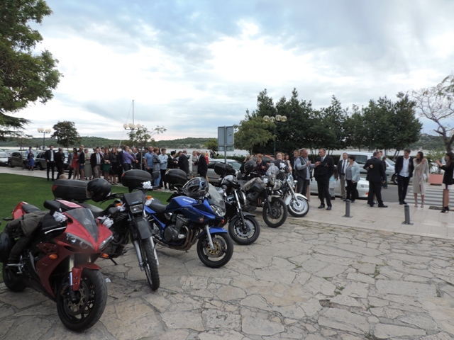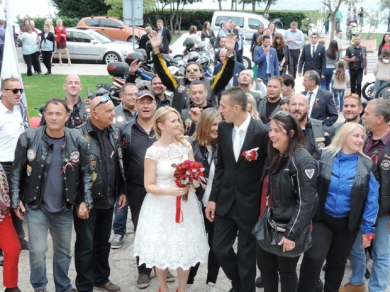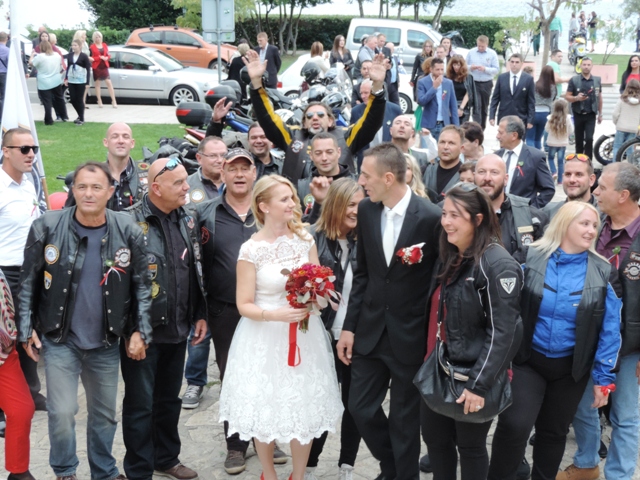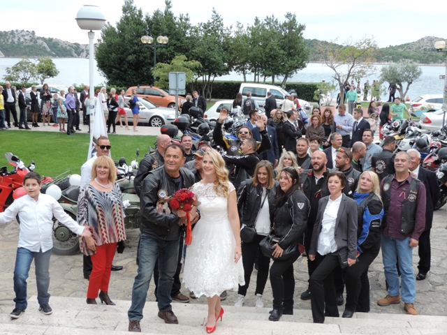 Bajkersko vjenčanje Nevena Škugora, predsjednika Moto kluba Galeb i njegove izabranice liječnice Sanje Belak iz Samobora izazvalo je danas pozornost šibenske javnosti posebno zbog toga toga što je na njemu, u Gradskoj vijećnici sudjelovalo četrdesetak bajkera, iz Šibenika, ali i iz Slavonskog Broda koji su na svojim motorima stigli ispred katedrale kako bi uveličali svadbeno slavlje svog člana. Čestitke mladencima!