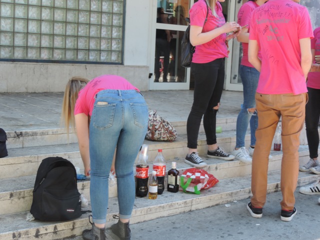 Maturanti šibenskih srednjih škola današnji, zadnji dan nastave obilježili su , kako se to kod nas već tradicionalno radi u dvorištima svojih škola treštećom glazbom i ispijanjem alkoholnih pića, već jutros od 10 sati. Prizori ispred svake od škola su gotovo identični osim što se razlikuju po majicama koje maturanti na sebi imaju – svaki razred svoju i to s otisnutim duhovitim porukama. Većina ih rado, pozira, s osmijehom na licu i, pivom , čašom vina, bocom viskija. Oproštaj od srednje škole slavi se bučno i strasno, a alkohol je u tomu nezaobilazan.
