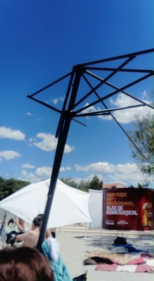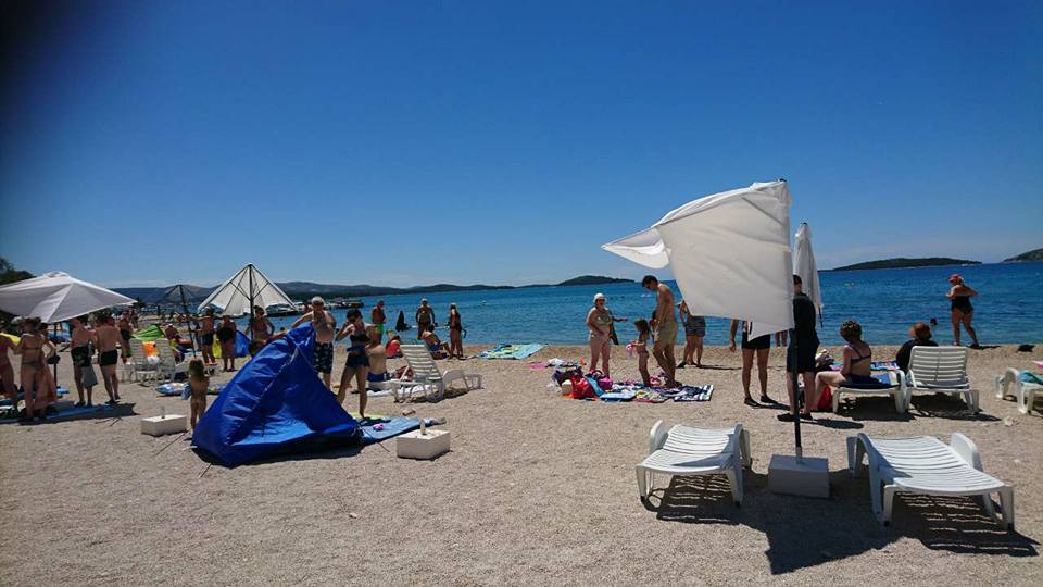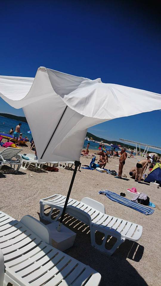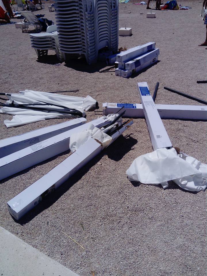 Plaža na Brodarici još uvijek funkcionira kao primjer, za sada, miroljubive koegzistencija kupaća i građevinskih radova. Vatreno krštenje koje nisu prošli jučer su imali novi suncobrani na plaži koji lijepo izgledaju, ali ne mogu izdržati udare jakog vjetra, u ovom slučaju tramuntane. Većinu suncobrana vjetar pokidao i pobacao na tlo, a biti kraj toga nije bilo nimalo bezazleno pa su neki kupači zaradili i ogrebotine.