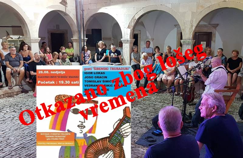 Manifestacija Krapanjske trubadurske večeri, trubadurski festival koji je trebao biti održan večeras u u 19,30 sati u klaustru crkve sv. Krža na otoku Krapnju, otkazana je zbog loših vremenskih prilika koje otežavaju brodsku i trajektnu vezu Brodarica – Krapanj – Brodarica.