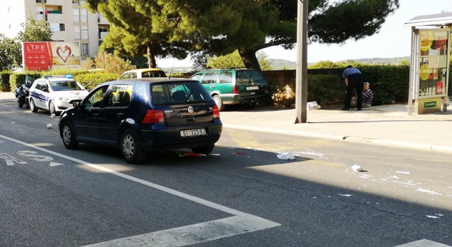 Osobni automobil marke Golf oborio je jutros oko 8. 30 sati pješakinju na pješačkom prijelazu na Baldekinu, kod autobusnog stajališta. Kada je prevezena vozilom Hitne pomoći bila je pri svojesti. Žena se, sudeći po tomu što su na mjestu nesreće razasute namirnice i mlijeko, prije nesreće obavila jutarnju kupnju.