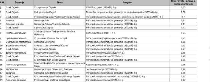 Riječ je o službenim podacima Ministarstva znanosti i obrazovanja prema omjeru kvote i broja kandidata kojima je to bio prvi izbor.