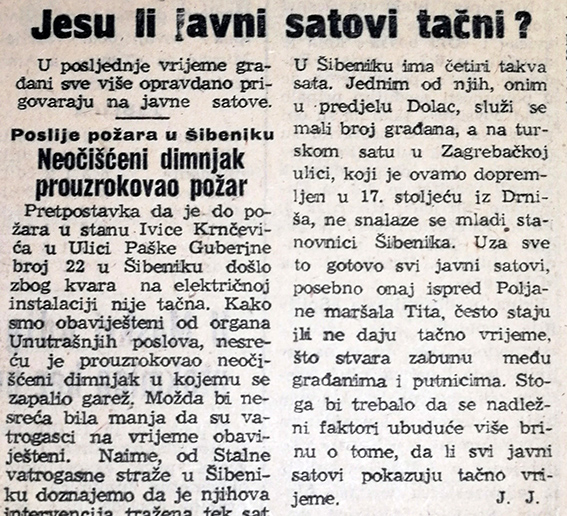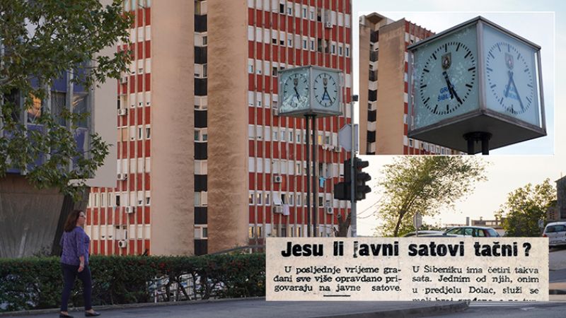 Pokazuju li javni satovi u Šibeniku točno vrijeme? To pitanje postavljeno 1965. godine aktualno je i danas. Je li to greška ili možda Šibenik živi u nekom svom drukčijem vremenu? O tome bi se dalo raspravljati iako problem, ruku na srce, i nije tako velik. Danas svatko ima mobitel koji pokazuje više nego točno vrijeme. No ipak ima nešto metaforično u tome da javni sat na Baldekinu nakon višemjesečne obnove nakon što je na njemu natpis JADRANSKA BANKA zamijenjen natpisom GRAD ŠIBENIK pokazuje dva različita vremena.