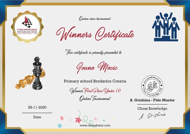 "Nakon osvajanja turnira u Sesvetama Ivano se još više posvetio šahu. Na žalost vrlo brzo je došlo do koronakrize koja je onemogućila treninge u klubu pa sam tražio po Internetu natjecanja na kojima bi mogao sudjelovati. Tako sam naišao na taj vrlo priznati i ozbiljan turnir u Dubaiju, u okviru Šahovske akademije, i to za djecu do 10 godina. Prošlog mjeseca je na turnirima bio četvrti pa treći,a ove subote je bio najbolji i danas nam je stigla diploma. Posebno bih se zahvalio Mariu Malenici koji nesebično odvaja svoje slobodno vrijeme da bih vježbao sa Ivanom kad god može", ispričao nam je Ivanov otac Ivan Močić.