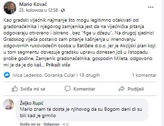 On je u svom postu reagirao i na to da je na natječaj za direktora tvrtke Batižele, s čijom se stručnom ekipiranošću također dobrano kasni, stigla samo jedna prijava i to anonimne pravnice, zaposlenice Općine Rogoznica iako je dogradonačelnik Mileta na sjednici Gradskog vijeća elaborirao o tome kako se traže provjereni stručni kadrovi.