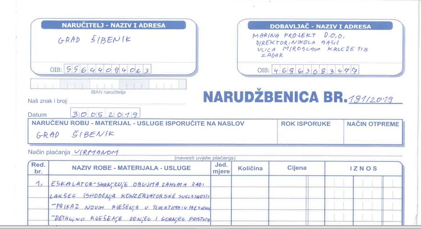 Kao potvrdu toga poslao nam je faksimil te narudžbenice i e mail poruku koju je posao dogradonačelniku Šibenika Danijelu Mileti u kojoj je reagirao na neprimjerenost korištenja njegovog autorskog djela u javnom pozivu kao i na to da jedini kriterij bude najniža cijena. Izrazio je nevjericu da „šibenski alternativni sustav urbanog prometa ( ŠIBENSKA OKOMICA ), koji je Marinaprojekt inicirao i na kojem rade i kojeg promoviramo kao autentičnu autorsku ideju punih četrnaest godina, sada, u segmentu žičare, ide u projektiranje temeljem javne nabave, čiji je jedini kriterij za izbor izvoditelja radova - najniža cijena (?!) i da se sada omogućava da njihovo višekratno javno objavljeno autorsko djelo interpretiraju drugi bez njihove suglasnosti”.