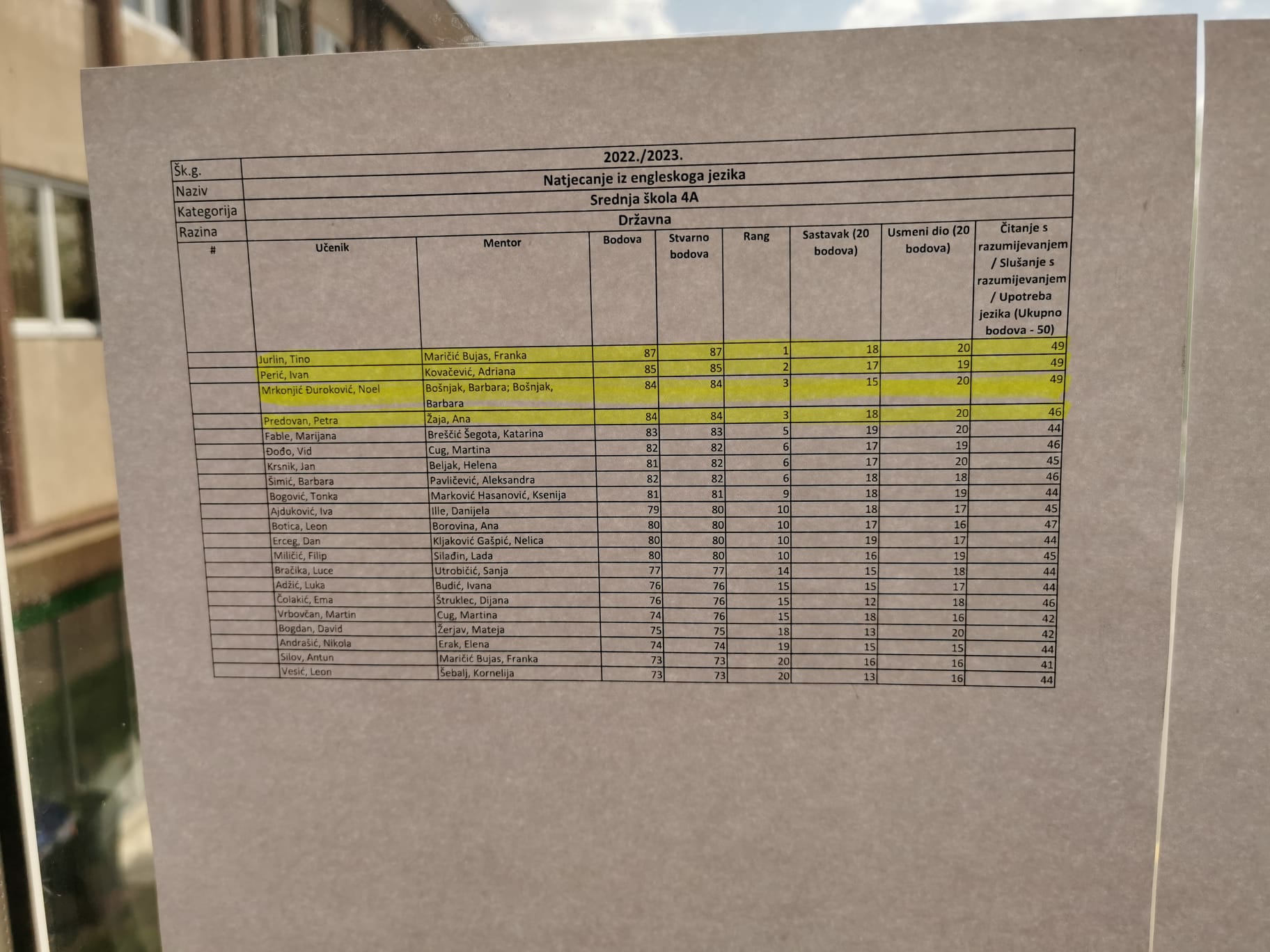„Svi su izvrsni, a najbolji među izvrsnima je Tino Jurlin čiji je vokabular 'above and beyond', prenoci ocijene Povjerenstva njegova mentorica Franka Maričić Bujas. Njegov kolega iz 4.a razreda Antun Silov i Bruna Belamarić, i 2.e, sa svojom mentoricom Jadrankom Goleš nisu se tako visoko plasirali, ali zadovoljni su svojim rezultatima. „Konkurencija je oštra i greške se skupo plaćaju ali iskustvo je dragocijeno”, kažu.