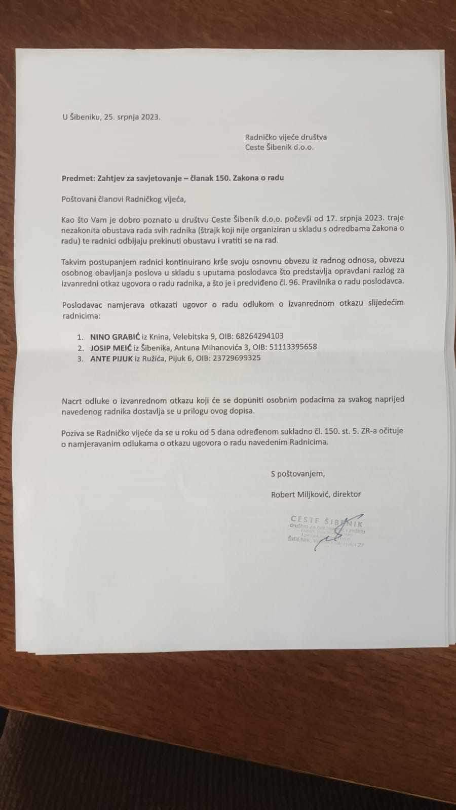 Miljković traži očitovanje Radničkog vijeća društva o tom Nacrtu odluke o izvanredni otkazima. U izjavi za Šibenik News kazao je da namjerava dati izvanredni otkaz toj trojici radnika jer su „poticali na nezakonitu obustavu rada”.
