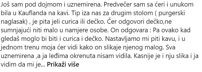 „Još sam pod dojmom i uznemirena. Predvečer sam sa ćeri i unukom bila u Kauflanda na kavi. Tip iza nas za drugim stolom, imao je purgerski naglasak, je pita jeli curica ili dečko. Čer odgovori dečko,ne sumnjajući niti malo u namjere osobe. On odgovara : Pa ovako kad gledaš moglo bi biti i curica i dečko. Nastavljamo mi piti kavu, i u jednom trenu moja ćer vidi kako on slikaje njenog malog. Sva uznemirena ,a ja leđima okrenuta nisam vidila. Kasnije je i nju slika i ja vidim da mi je ćer sve više uznemirena. Uzimam dite i ulazim u kafić. Konobarica izlazi i govori mu da je slika dite i da zašto to radi . On govori da je to cool. Nakon toga ,konobarica ulazi u kafić i zove policiju. Dakle taj je tip cilo popodne proveja u Kauflanda , i slikava dicu. I od turista i našu. Čer mi se na kraju rasplakala od straha. Došla je policija al je on prije napustija Kaufland. U razgovoru sa policijom smo doznali da znaju di se nalazi i da ne brinemo. Zašto ovo pišem. Pripazite, ako išta primijetite prijavite. Grozna vrimena”, prepričala je jedna Šibenčanka svoje iskustvo.