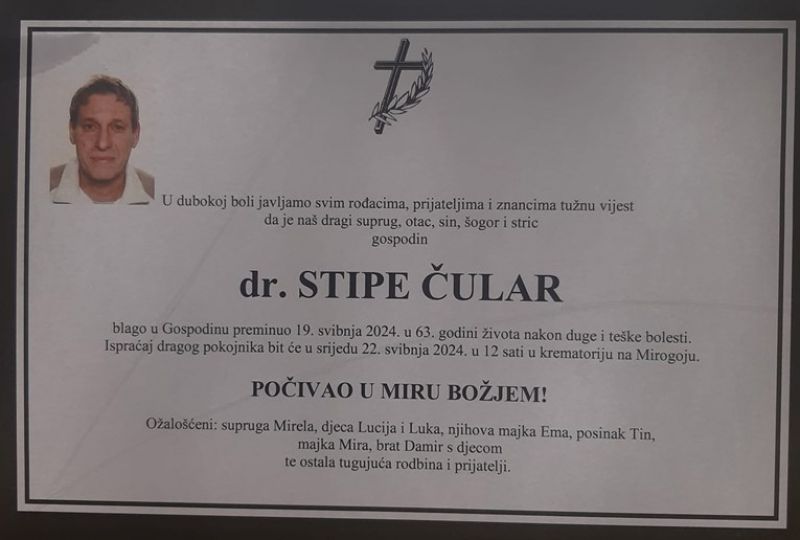 Stipe Čular, pedijatar u Domu zdravlja Špansko u Zagrebu, rodom iz Šibenika, preminuo je u 63. godini nakon duge i teške bolesti.