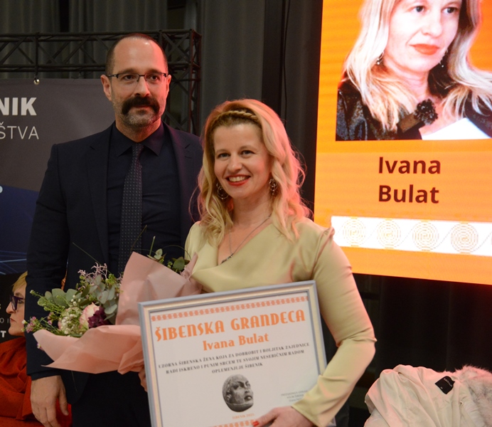 Svečanost uručenja nagrade održana je u Centru za nove tehnologije "Trokut" u nazočnosti brojne publike, a Ivana Bulat nije mogla sakriti iznenađenje i uzbuđenje nakon što je proglašena Šibenskom grandecom pa je nakon toga doslovno ostala bez riječi i pokazala da u takvim trenutcima ne trebamo skrivati svoje emocije . Iza imena Ivane Bulat, rođene Šibenčanke iz obitelji Dobre, krije se puno toga. Ona je magistra ekonomije i financija, doktorandica psihologije i savjetodavna psihoterapeutkinja. Volonterski pomaže brojnim ljudima, prvenstveno ženama žrtvama obiteljskog nasilja i ljudima koji pate od depresije i anksioznosti, a volonterski je radila i u udruzi „Ardura”. U javnosti nije previše vidljiva i prisutna, ali oni koji prate njezin rad smatraju da je zaslužila ući u uži krug izbora za „Šibensku grandecu”, ženu koja „pomiče granice i radi na unapređenju života u lokalnoj zajednici. Na početku ovog razgovora kroz koji se, kao kandidatkinja za „Šibensku grandecu”, predstavlja javnosti, zanimalo nas je kako je povezala ekonomiju i financije s psihologijom i pomoći ljudima.Psihoterapija kojom se bavi nije samo njezina profesija, nego, kako kaže, i životni poziv i velika ljubav. Najveći dio toga radi volonterski i to s grupama ljudi koji pate od depresije i anksioznosti i ženama žrtvama nasilja. Organizira i online tečajeve na razini Hrvatske i šire za žene koje su žrtve nasilja svojih partnera. Ona svoju misiju psihološke pomoći drugima širi i na umjetničkoj razini pišući pjesme i psihološke romane. Objavila je psihološki roman „Panta Rei” je objavila, a drugi je u pripremi.