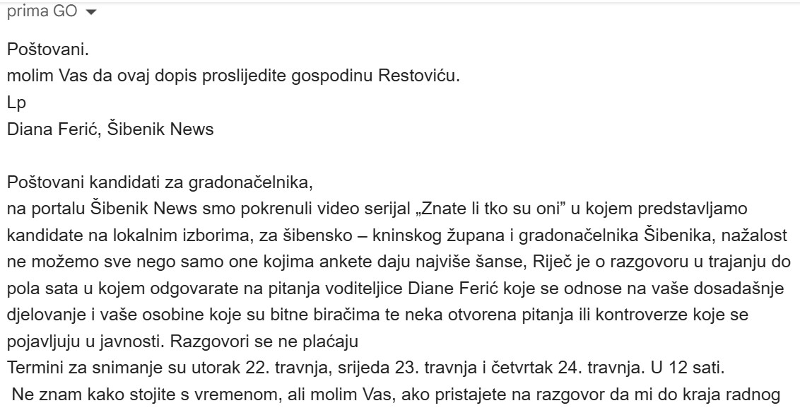 Ono što želim javno kazati je da je gospodin Restović za promidžbu na portalu ŠibenikNews imao jednake uvjete kao i HDZ zbog kojeg me proziva dovodeći u pitanje moj profesionalizam koji gradim već 40 godina. Naime, prije službene predizborne kampanje bio je pozvan ga gostuje u našem podcastu “Znate li tko su oni” koji je za kandidate na izborima za župana i gradonačelnika bio besplatan s tim da nisu imali pravo na naručena i dogovorena pitanja. Odazvali su se svi pozvani osim Tončija Restovića i Iris Ukić Kotarac koja se barem javila i nedolazak opravdala drugim obvezama. Ne samo da se Tonći Restović nije odazvao nego nije niti odgovorio na ponudu. Poslala sam mu i e-mail, ali nije odgovorio. Potom sam nazvala GO SDP-a i Anitu Jakšić zamolila da mu prenese još jedom poziv i da čekam odgovor. Opet ništa. Nakon toga poslala sam mu poruku preko Whatsappa, ali opet odgovor nisam dobila. Na kraju sam ga uspjela dobiti putem telefona. Kazao mi je da je na sjednici Sabora i da će mi se javiti. Naravno, nije se javio jer tko sa ja da sebi dopuštan pozivati ga u autorsku emisiju i postavljati mu pitanja po svom izboru?!