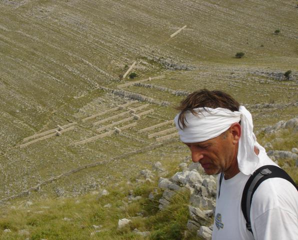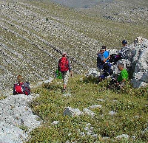 Podno Velog vrha s istočne strane nakratko nam se otvorio pogled na lijepu uvalu Bikarijicu dok smo se uz njegovu nepreglednu jugoistočnu padinu žustro penjali kao da ga namjeravamo uzjahati. Nagrada za neznatan napor bila je veličanstvena. S Velog vrha vide se cijeli Kornati. Tek ovdje je moguće shvatiti zašto im se svi dive i pripisuju im božansko podrijetlo. Nastavak puta čini se kao hod sredinom palube nekog golemog prekooceanskog broda kojem se pramac zove Opat, a krma Proversa. Brdo Metlina koje nas je u daljini strpljivo čekalo u tom je slučaju zapovjedni most te kamene lađe koja plovi oceanima vremena. Usprkos svim nastojanjima da se držimo zajedno, naša se grupa razdvojila. Najveći sam krivac bio ja jer sam izgubio mobitel pa sam se morao vraćati ne bih li ga našao. Našao sam ga među škrapama nazivajući sam sebe posuđenim mobitelom, a za to vrijeme većina grupe već se penjala na Metlinu, najviši vrh otoka Kornata. Jedna manja grupa krenula je za glavninom, a druga se spustila u uvalu Ropotnicu. Pošao sam prema Ropotnici jer sam na Metlini već bio, a postojao je plan da se od Ropotnice do uvale Kravjačice prebacimo brodom. Rekli su da će čekati u Bebanovom stanu, suhozidom ograđenom imanju koje se sastoji od kamene poljske kućice, torova za ovce, male gusterne i još nekih minijaturnih pomoćnih objekata. Ali kada sam stigao, ondje je bila još samo Alana. Čekajući me, zaspala je u tankoj hladovini pored otvora gusterne. Bilo mi ju je žao probuditi pa sam sjeo pored nje, uživao u tišini, koju je narušavao samo šum vjetra u krošnjama okolnih maslina, i pojeo nešto da zatomim glad. Ne znam tko je u tim trenucima sanjao ljepši san, usnula Alana ili ja koji sam širom otvorenih očiju upijao nestvarnu ljepotu oko sebe.